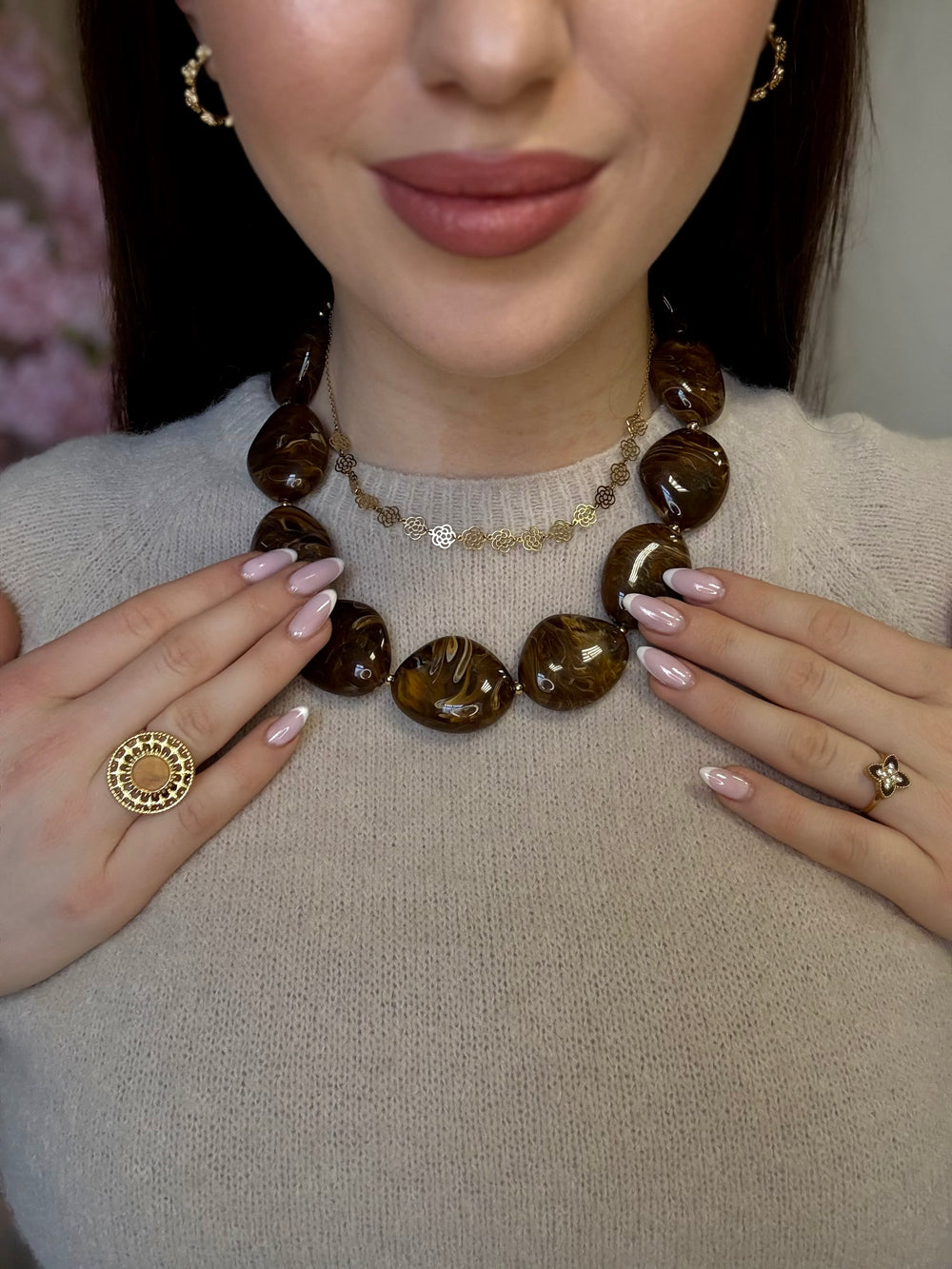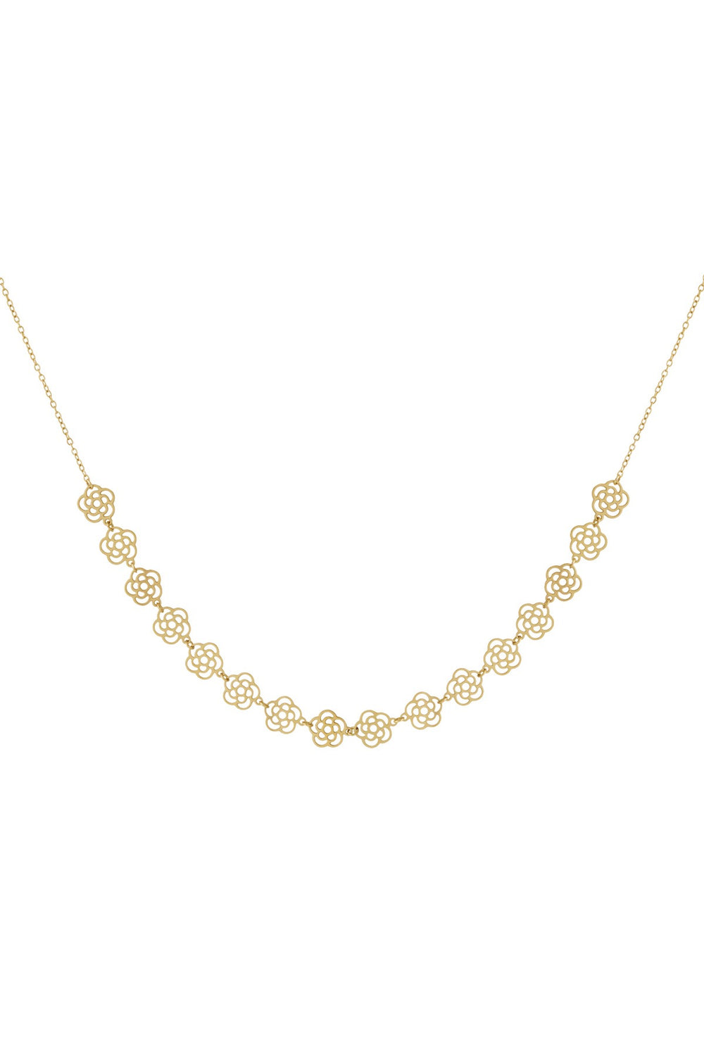 Een gouden ketting met subtiele roosjes die schitteren bij elke beweging. Romantisch en elegant, perfect om je look een verfijnde en vrouwelijke touch te geven.