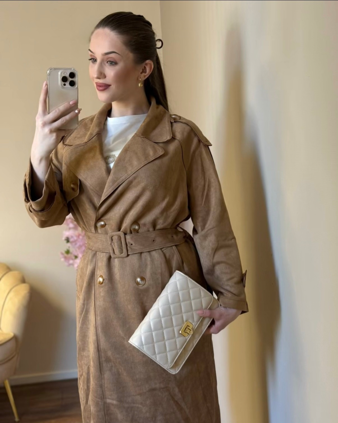 De Valencia trenchcoat straalt tijdloze elegantie uit met haar luxe suèdine stof en verfijnde silhouet.Een klassieke must-have die elke outfit moeiteloos naar een hoger niveau tilt 🤎