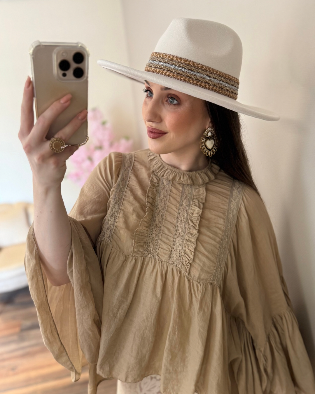 Voeg een vleugje glamour toe aan je look met onze Shine under the sun hoed. De beige kleur gecombineerd met subtiele glinsterende details geeft je de perfecte balans tussen elegantie en sprankeling, ideaal voor een zonnige dag vol charme.